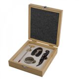 Комплект за вино с шах, 5 части, дървена кутия – тирбушон, тапа, аератор, ринг за бутилка, термометър. Материал: дърво и метал. Размер на артикула: 360х210х160 mm. Печатаемо поле: 170х30 mm. Печат: ситопечат, гравиране.