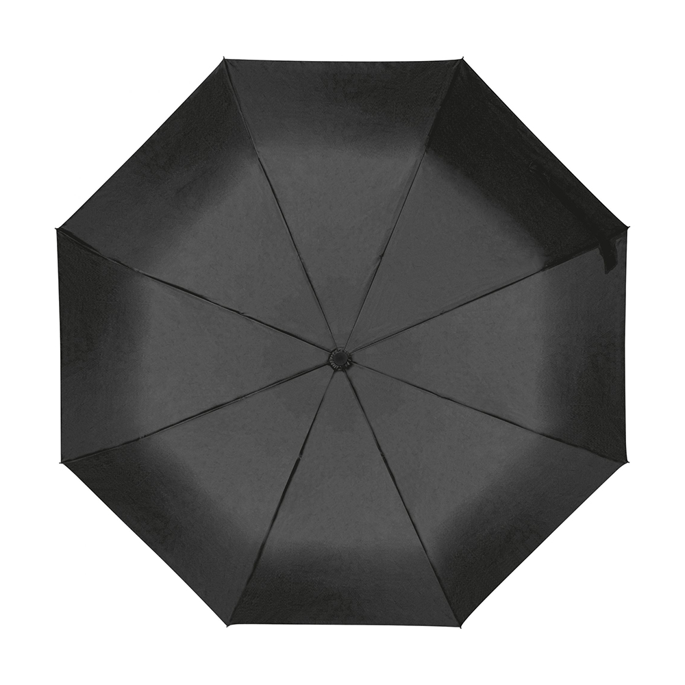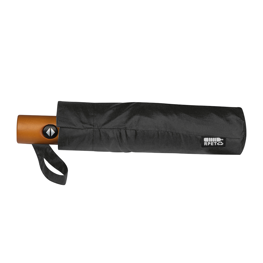 Джобен чадър с автоматично отваряне и затваряне, изработен от рециклирани полиестерни бутилки, ребра от фибростъкло, дървена дръжка и каишка за китка.