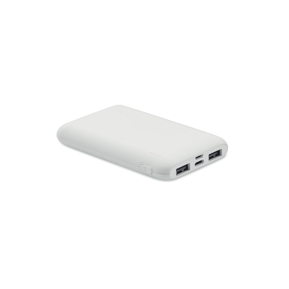 Външна батерия с капацитет 5000 mAh от рециклирана пластмаса в кутия. Включва зареждащ кабел. Изход: 1 x Type-C, 2 x Type-A & 1 x Type-B. Вход: 2-в-1 Тип C & Тип-A