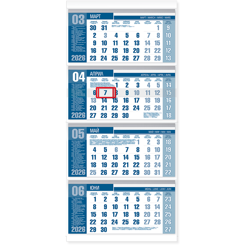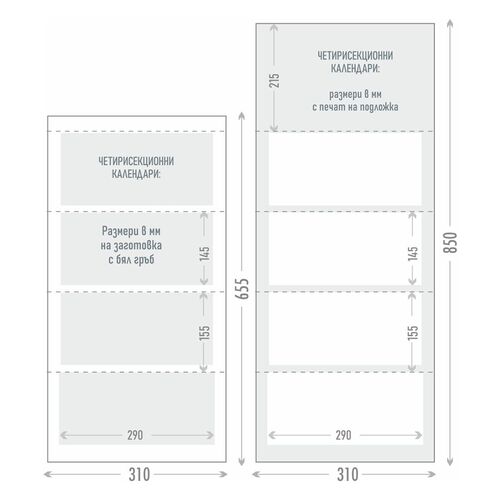 Четирисекционен работен календар, отпечатан на 70г/м2 офсетова хартия.