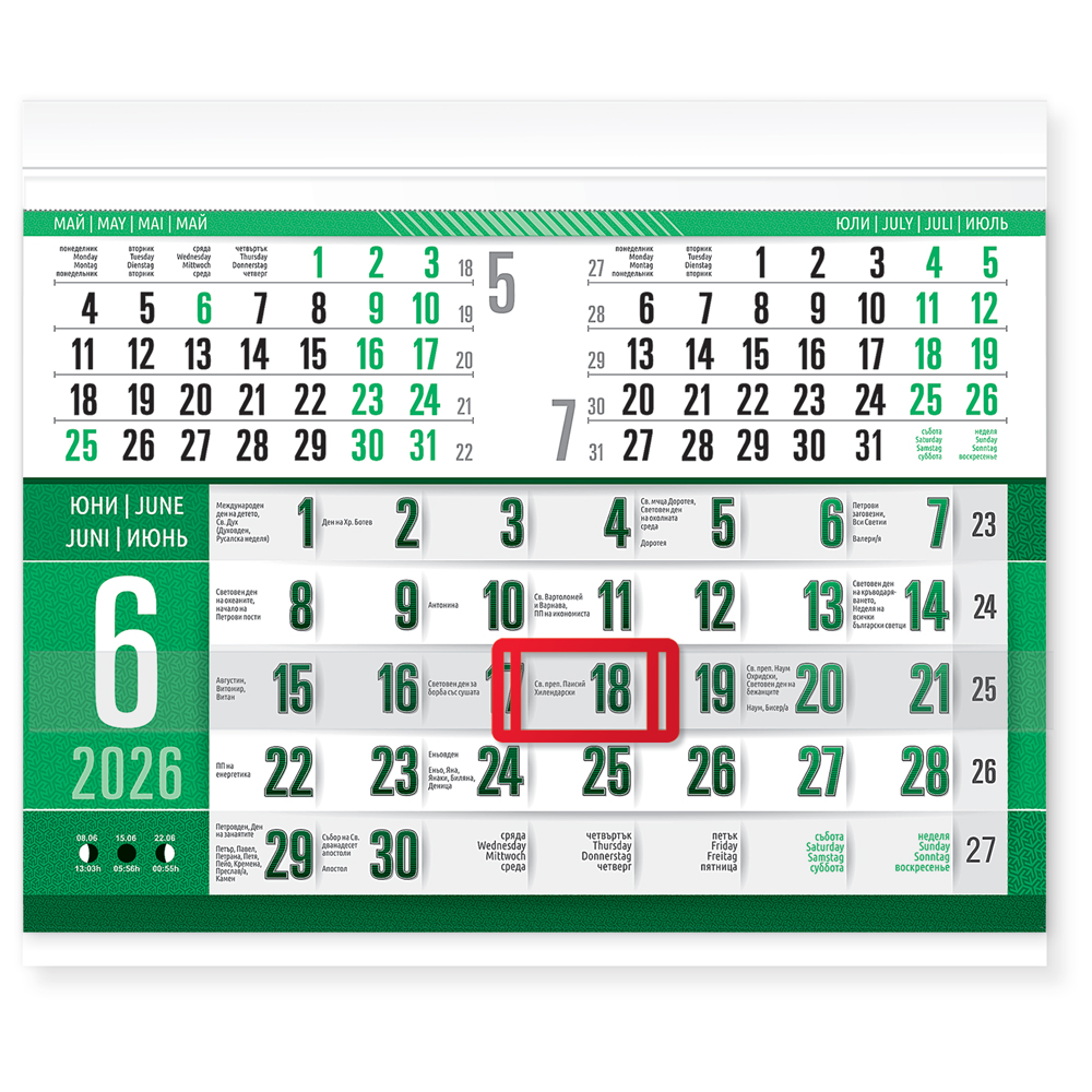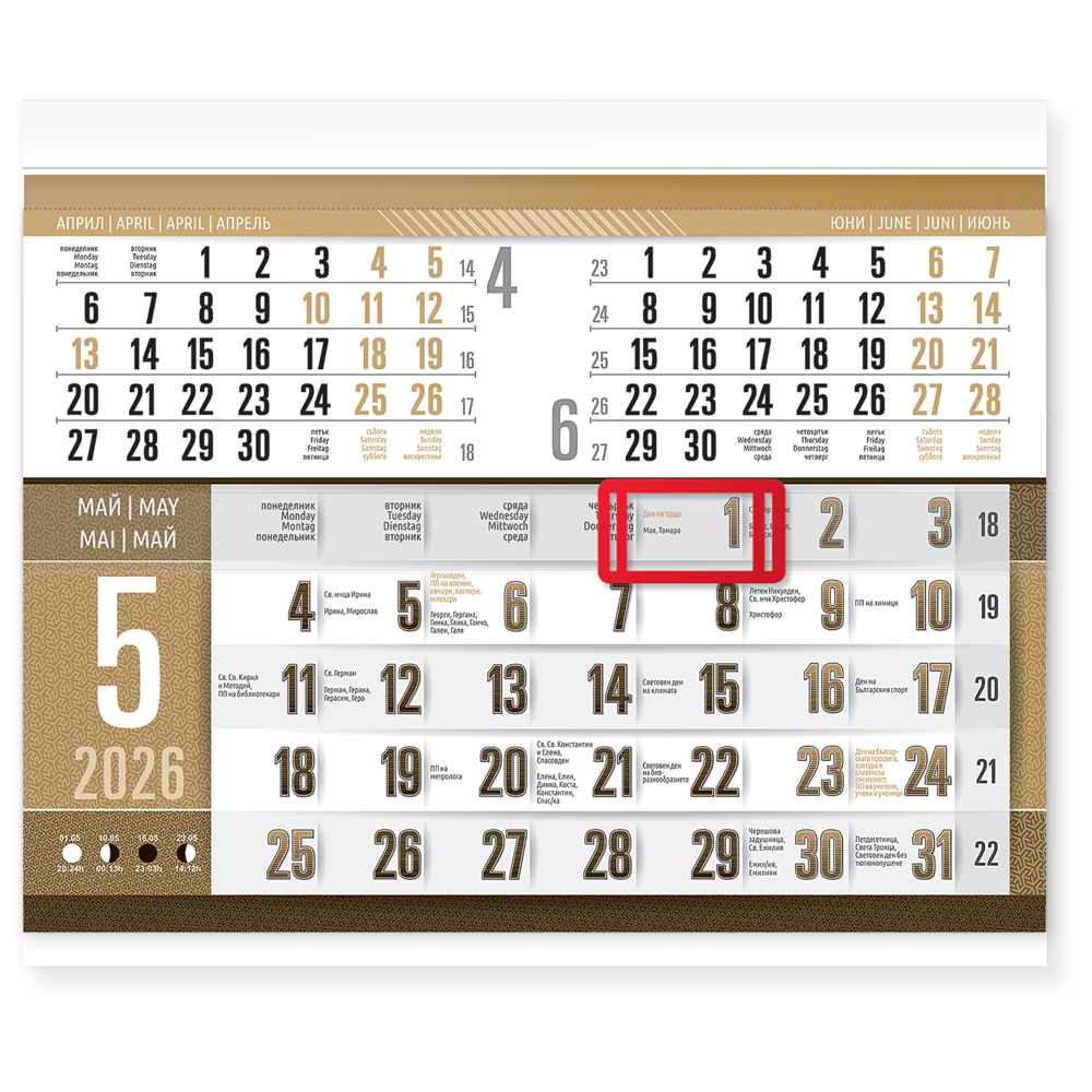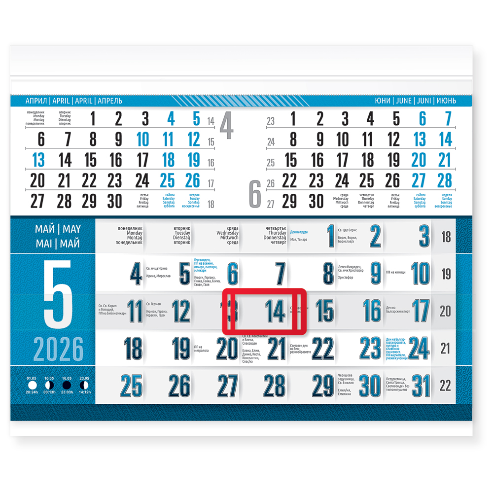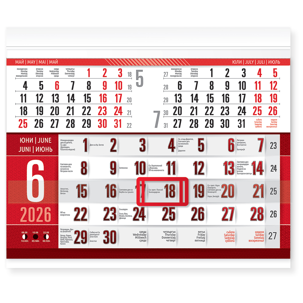 Цветна и отличаваща се визия на тетрадката, с максимални размери за този вид продукти. Висок контраст на календариума и полезна информация за всяка дата. КАЛЕНДАРИУМ: 4 езика - български, английски, немски, руски.