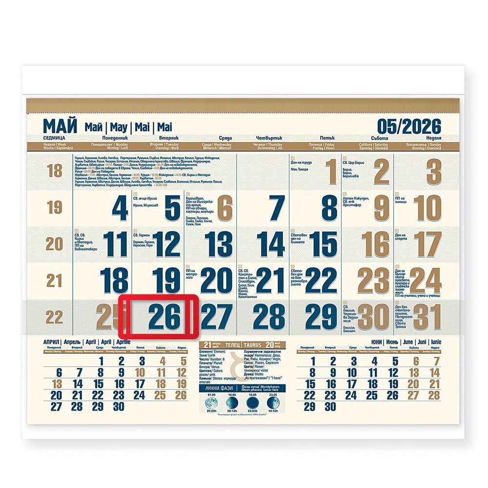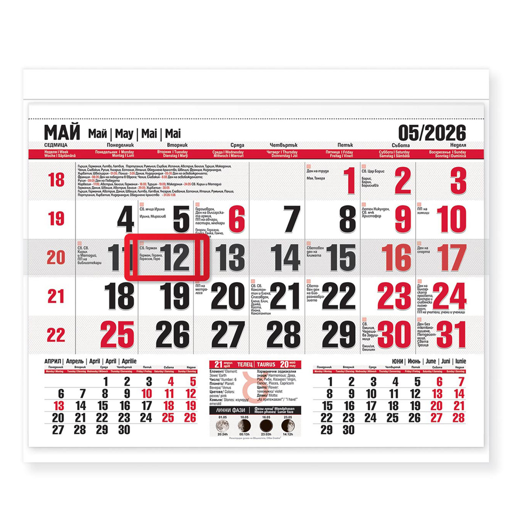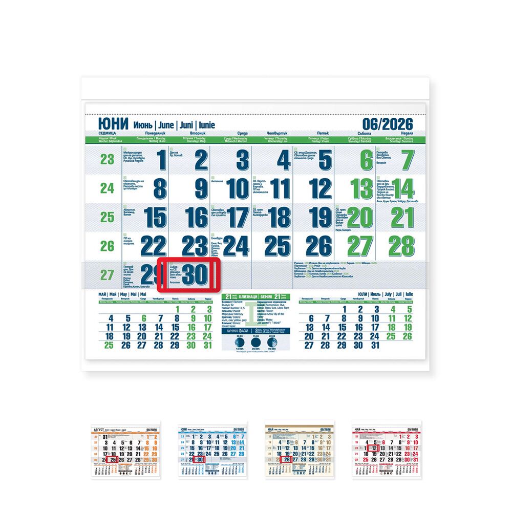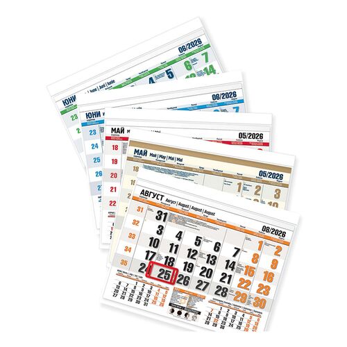 Този офсетов календар е с богата информационна част и отличаващи се цветове.