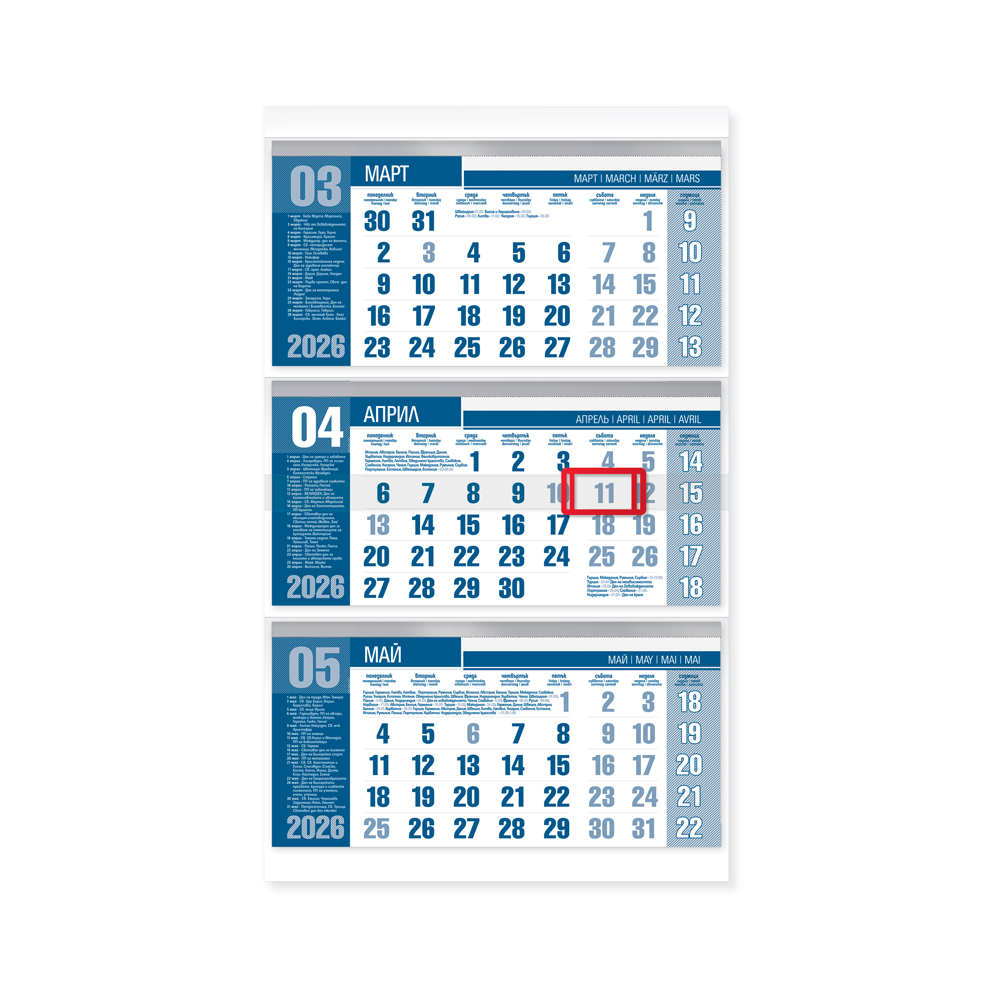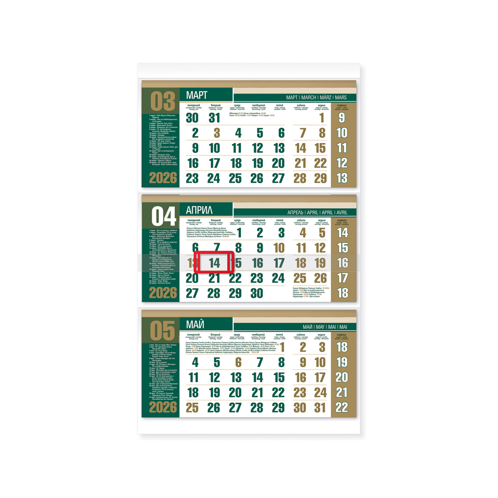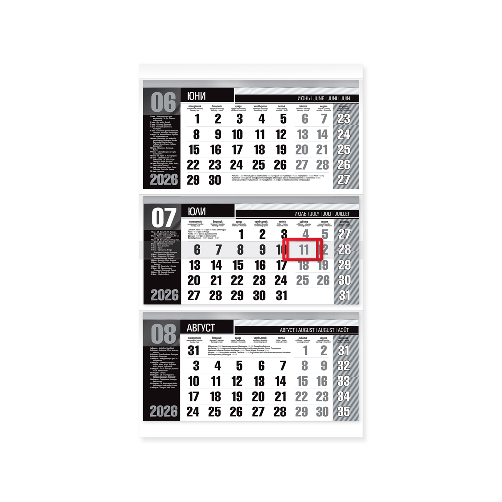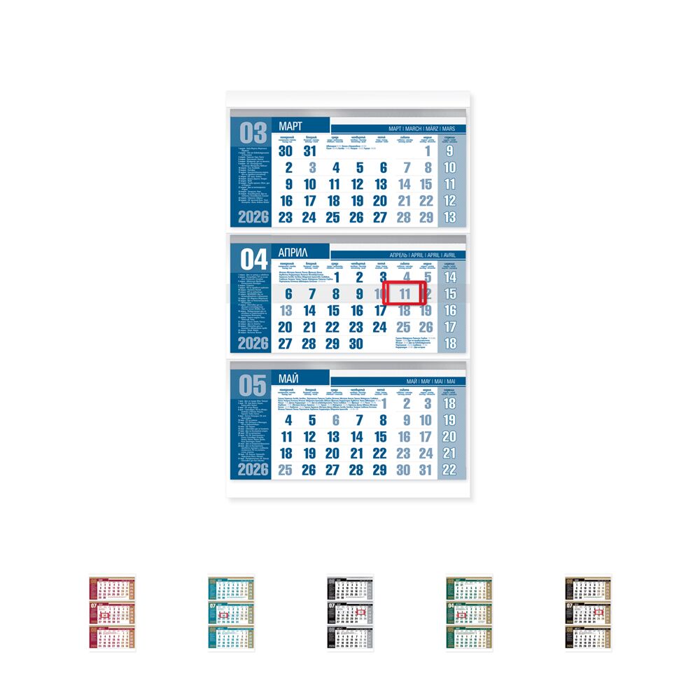 Богатата информационна част, както и големите цветни полета, правят тази серия календари предпочитан избор. Серията е в шест цветови варианта в комбинация от сребърен и златен бронз, създаващи усещането за лукс и изтънченост.