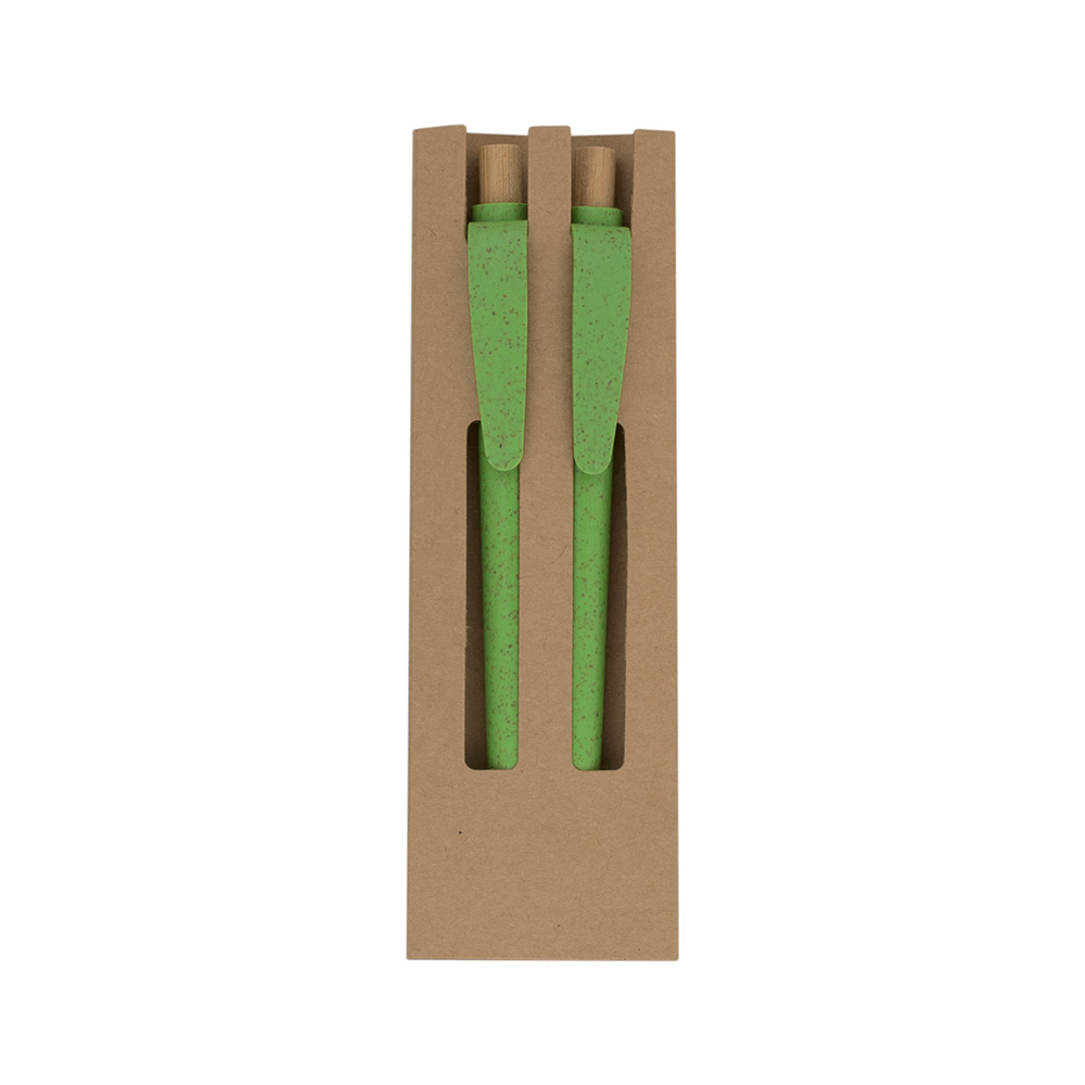 Комплект химикалки в калъф. Материал пишещи средства: пшенична слама и полипропилен. Материал калъф: картон. Размер калъф: 50x155x1 mm. Печатаемо пишещи средства: 25х6 mm. Печат: тампонен, ситопечат.