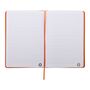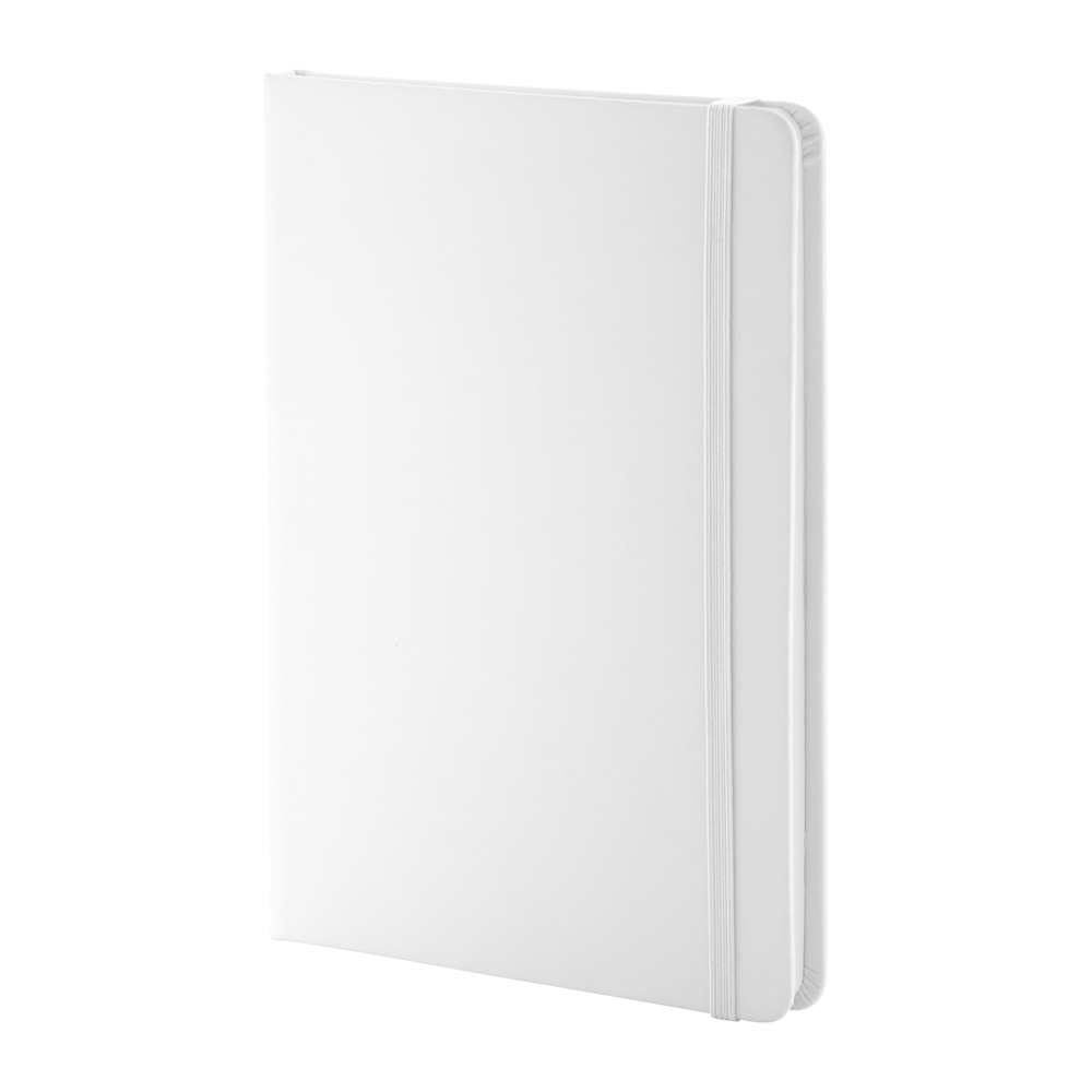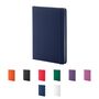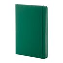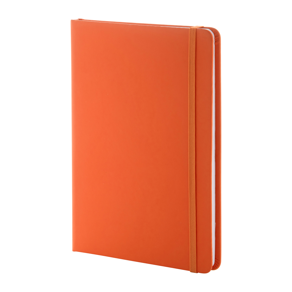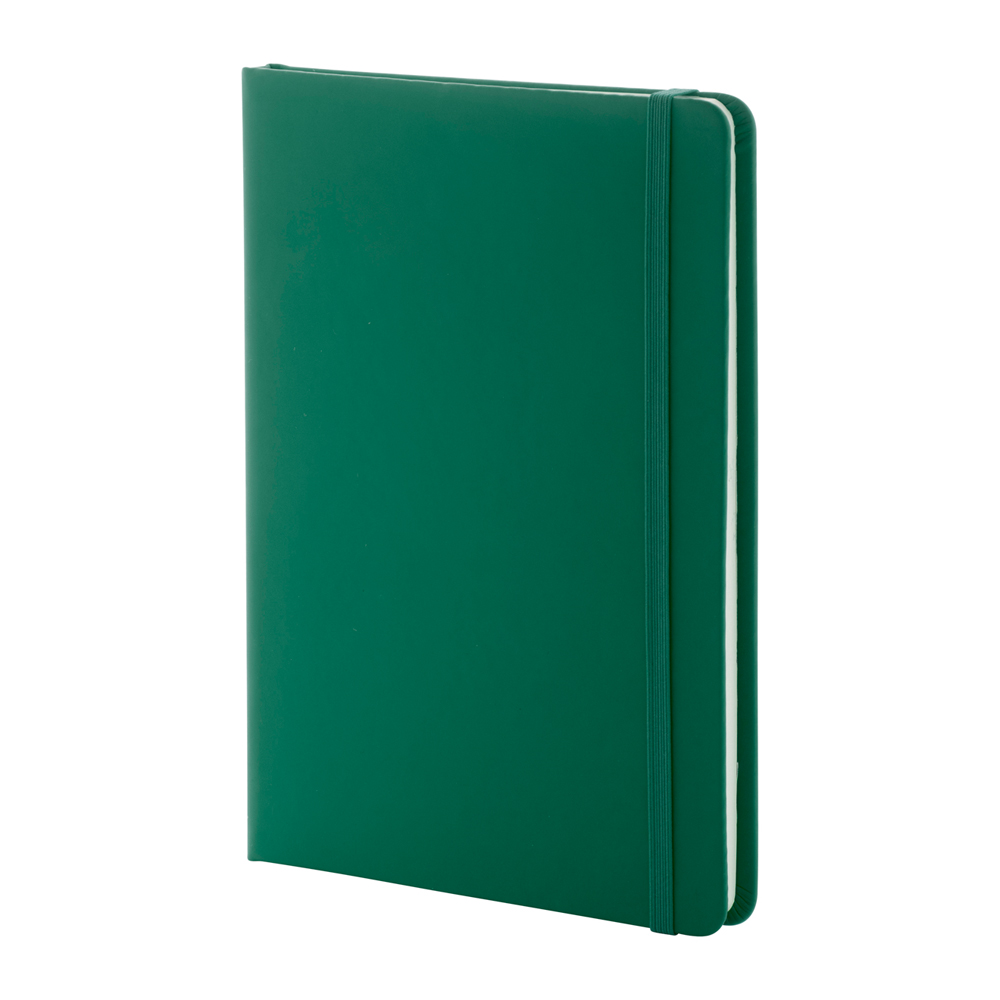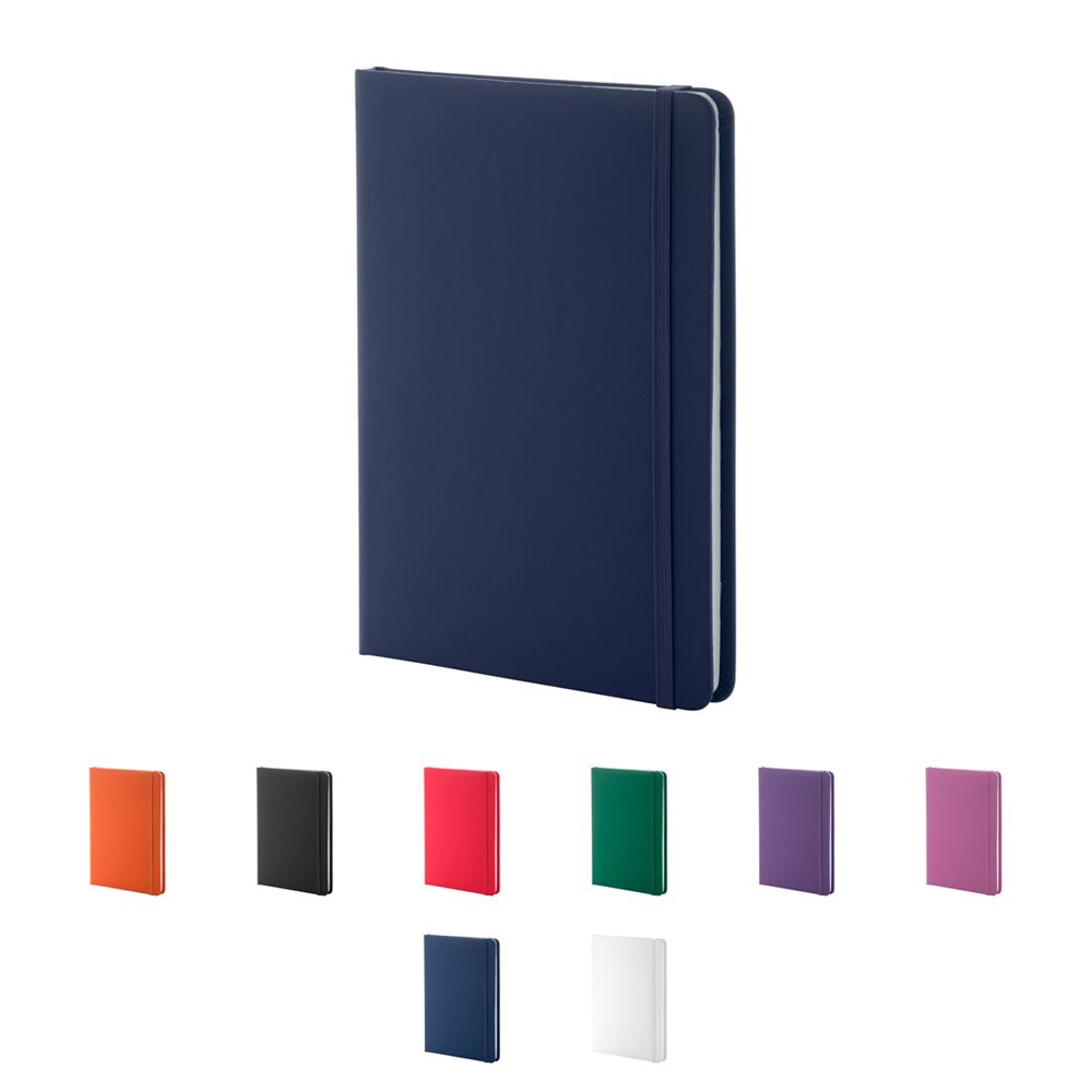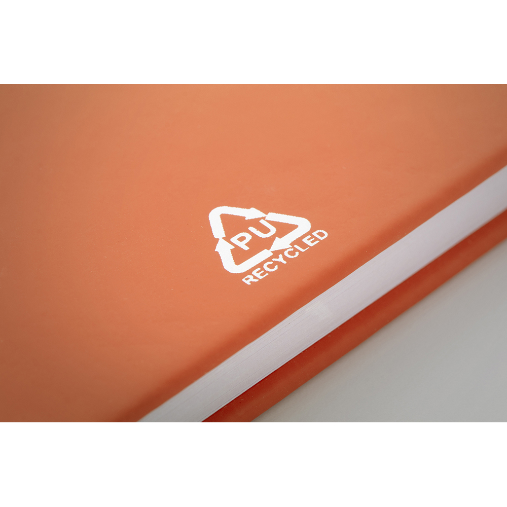 Бележник размер А5 с твърди корици от рециклирана еко кожа със 160 страници на редове от рециклирана хартия. С отметка в съответстващ цвят и ластик.