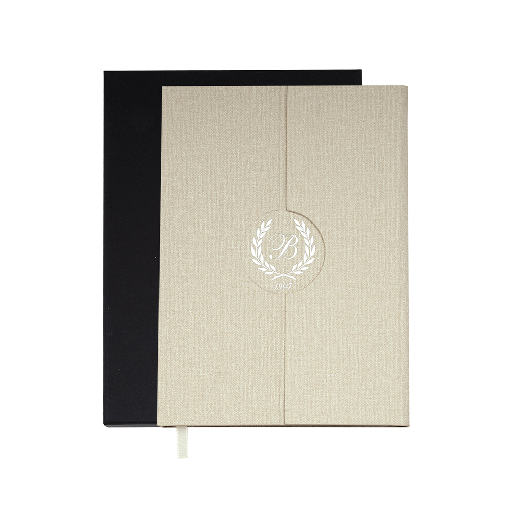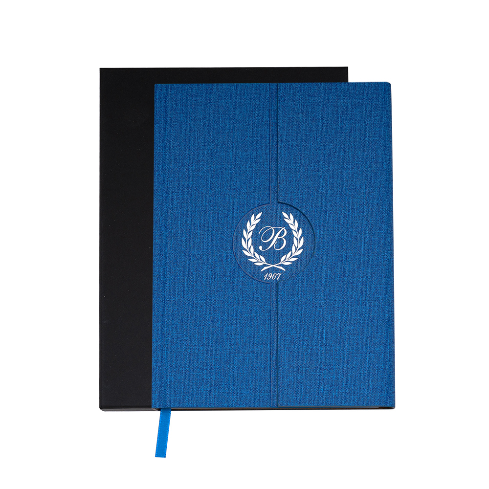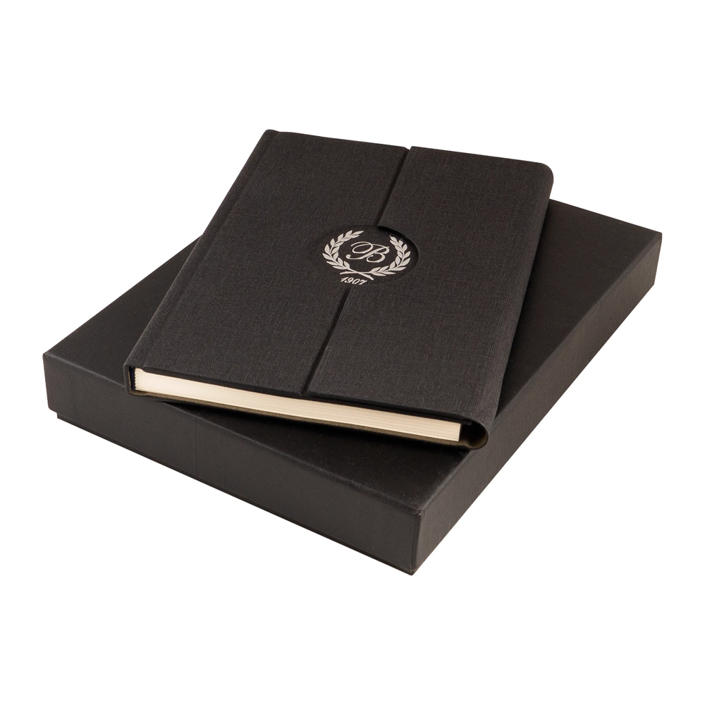Луксозен тефтер от лимитирана серия на F. Bartholdi с магнитно затваряне на кориците. 200 броя тонирани страници на черни редове. Подходящ за тези клиенти, които търсят високо качество с ефектно брандиране от висок клас.