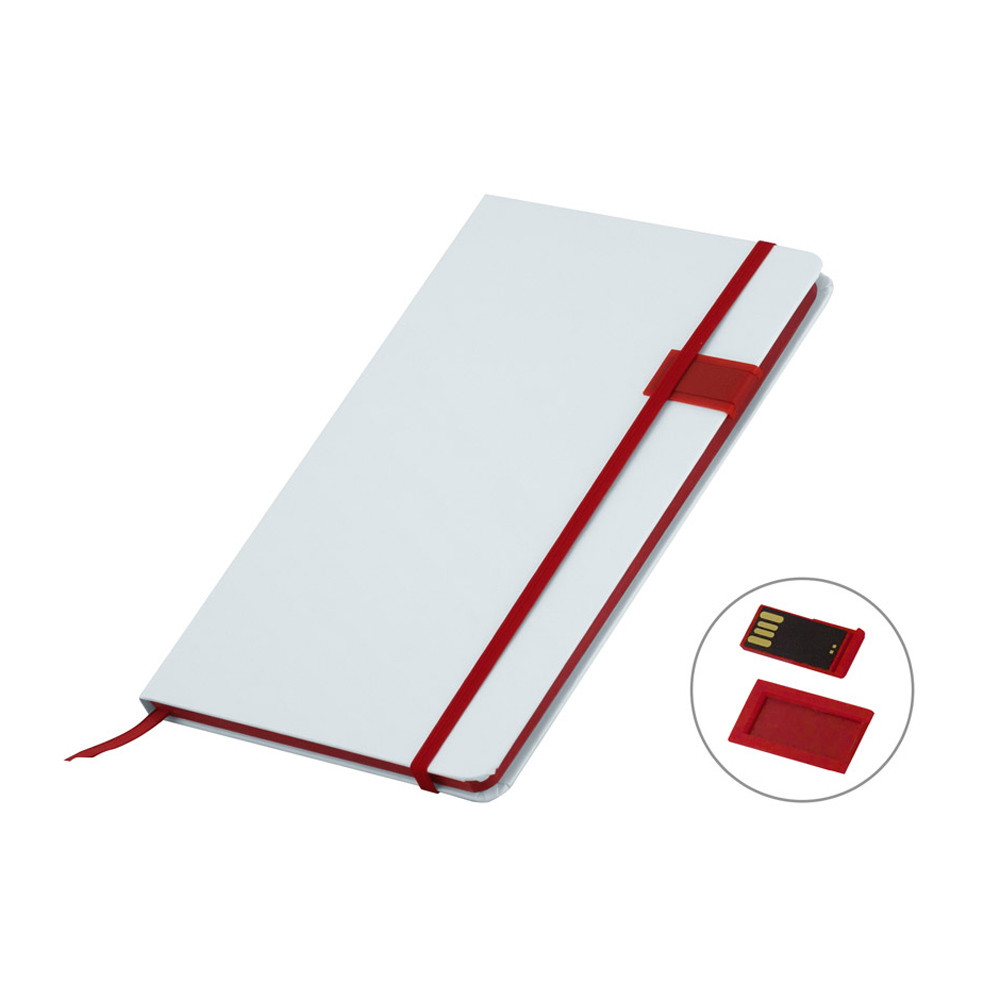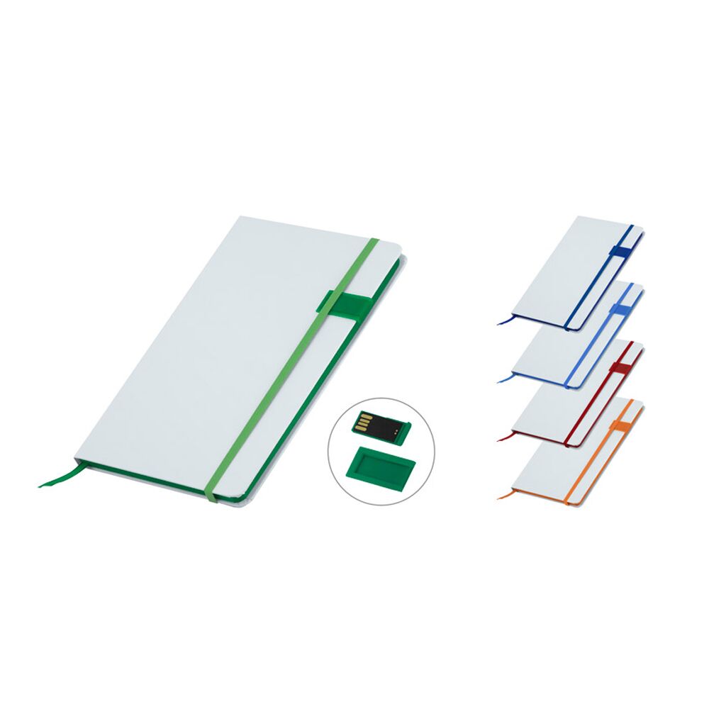 Тефтер A5 с вградено USB 64GB, ластик, разделител, 80 листа с редове, цвят на хартията слонова кост с цветен ръб, твърда корица. Материал: PU, хартия. Размер на артикула: 140х210х10 мм Печатаемо поле: 70х30 мм Печат: Дигитален UV печат