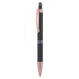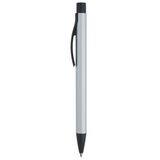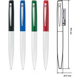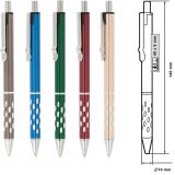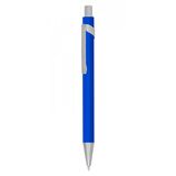 Метална рекламна химикалка с щракащ механизъм и цветно гумирано покритие.