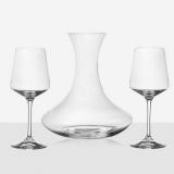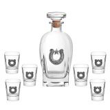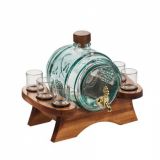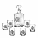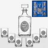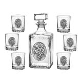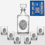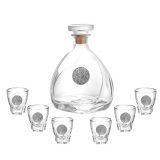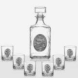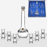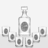 Сет за алкохол от стъкло, издържан в класически стил, състоящ се от 6 бр. чаши и четвъртита бутилка с масивна стъклена запушалка. Този строг дизайн завършва визията си с изящно инкрустиран метален грозд с листа от калай и сребро и гравюра с изображение , което го превръща в луксозно празнично предложение, обогатяващ етикета на сервиране на качествени напитки. Произведен от Artina, Австрия. Височина бутилка 24 см, височина чаши 8,5 см. Вместимост на чашите 200 мл. , вместимост на бутилката 1000 мл.